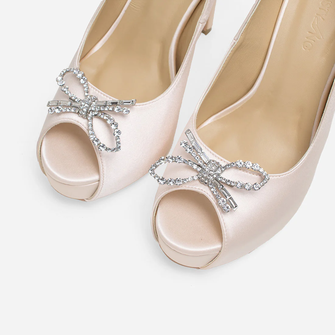 Stand out during your big day with Christy Ng's Starling Soft Rose Love Wedding Pumps. This handcrafted platform pump is set on a classic slim heel and finished in smooth luxurious satin. Embellished with crystal-encrusted bow topped with glittering crystal embellishments, these pair of heels are sure to make heads turn.